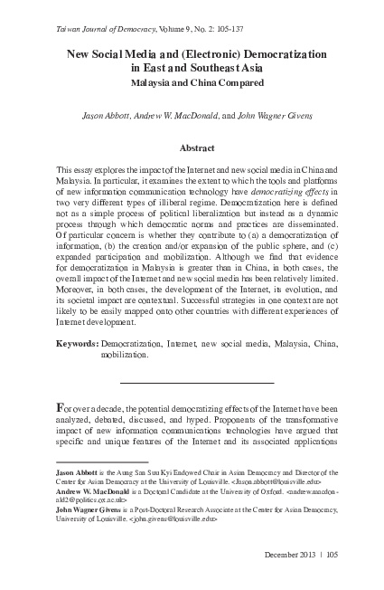 Pdf New Social Media And Electronic Democratization In East And Southeast Asia Malaysia And China Compared Jason P Abbott And John Wagner Givens Academia Edu