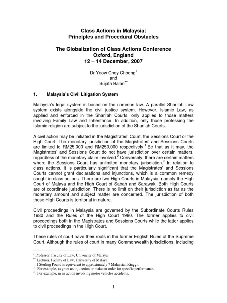 Class Actions In Malaysia Principles And Procedural Obstacles The Globalization Of Class Actions Conference Oxford England 12 14 December 2007 Dr Yeow Choy Choong And Sujata Balan Standing Law Supreme Courts