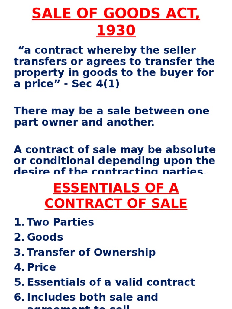 Sale Of Goods Act 1930 A Contract Of Sale Of Goods Is A Contract Whereby The Seller Transfers Or Agrees To Transfer The Property Seller Acting Things To Sell