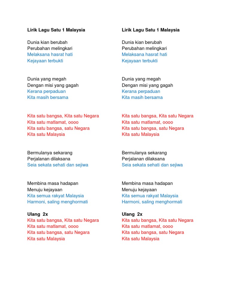 Lirik Satu Malaysia Dan Sehati Sejiwa Docx