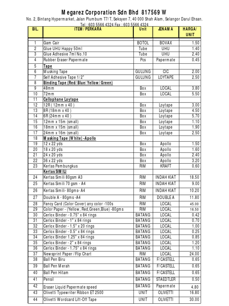Senarai Harga Alat Tulis Pejabat 2019