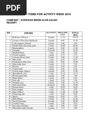 List Of Items For Activity Week 2019 Company Koperasi Mrsm Alor Gajah Receipt Food Ingredients Food And Drink Preparation