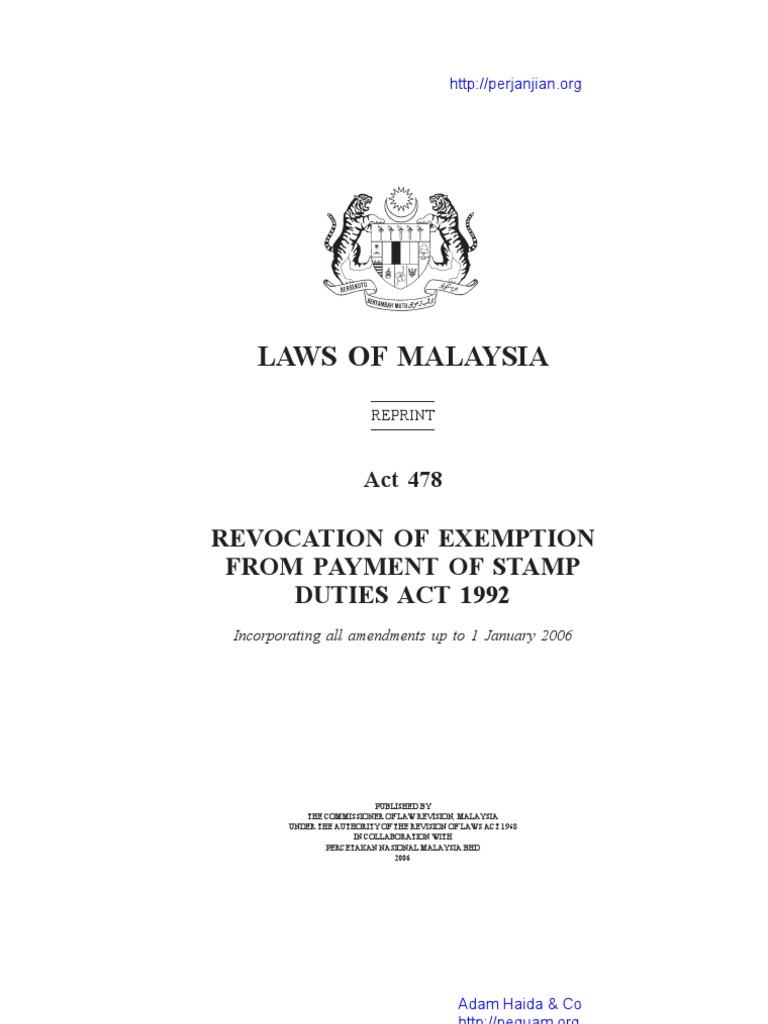 Act 478 Revocation Of Exemption From Payment Of Stamp Duties Act 1992 Malaysia Government