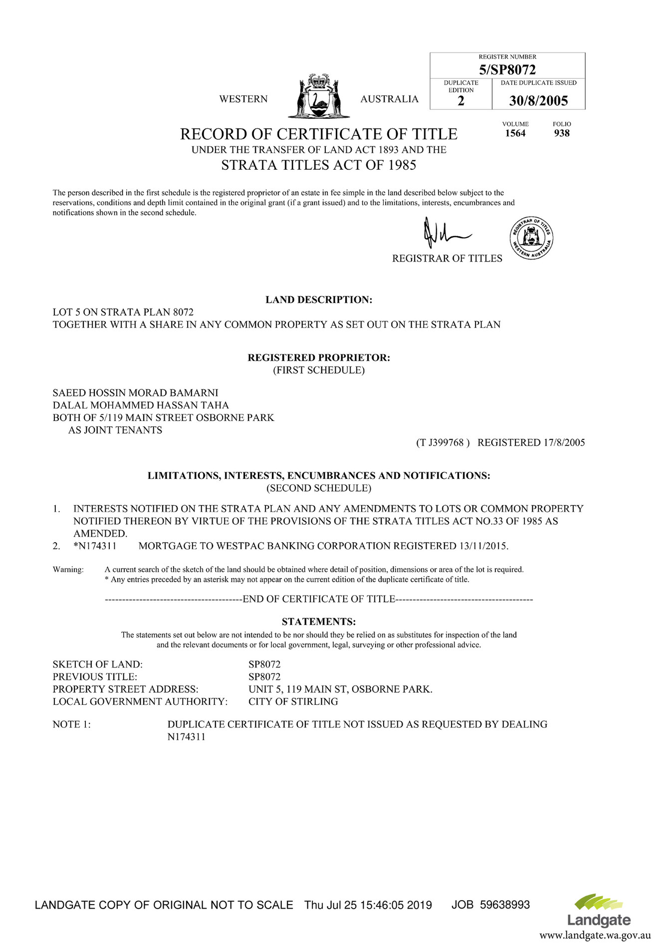 Teamiaconi Certificate Of Title For Unit 5 H 119 Main St Osborne Park 6017 Lot 5 On Strata Plan 8072 Title Page 1 Created With Publitas Com
