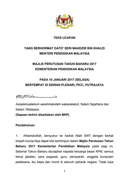 Teks Ucapan Yb Menteri Pendidikan Sempena Majlis Perutusan Tahun Baha