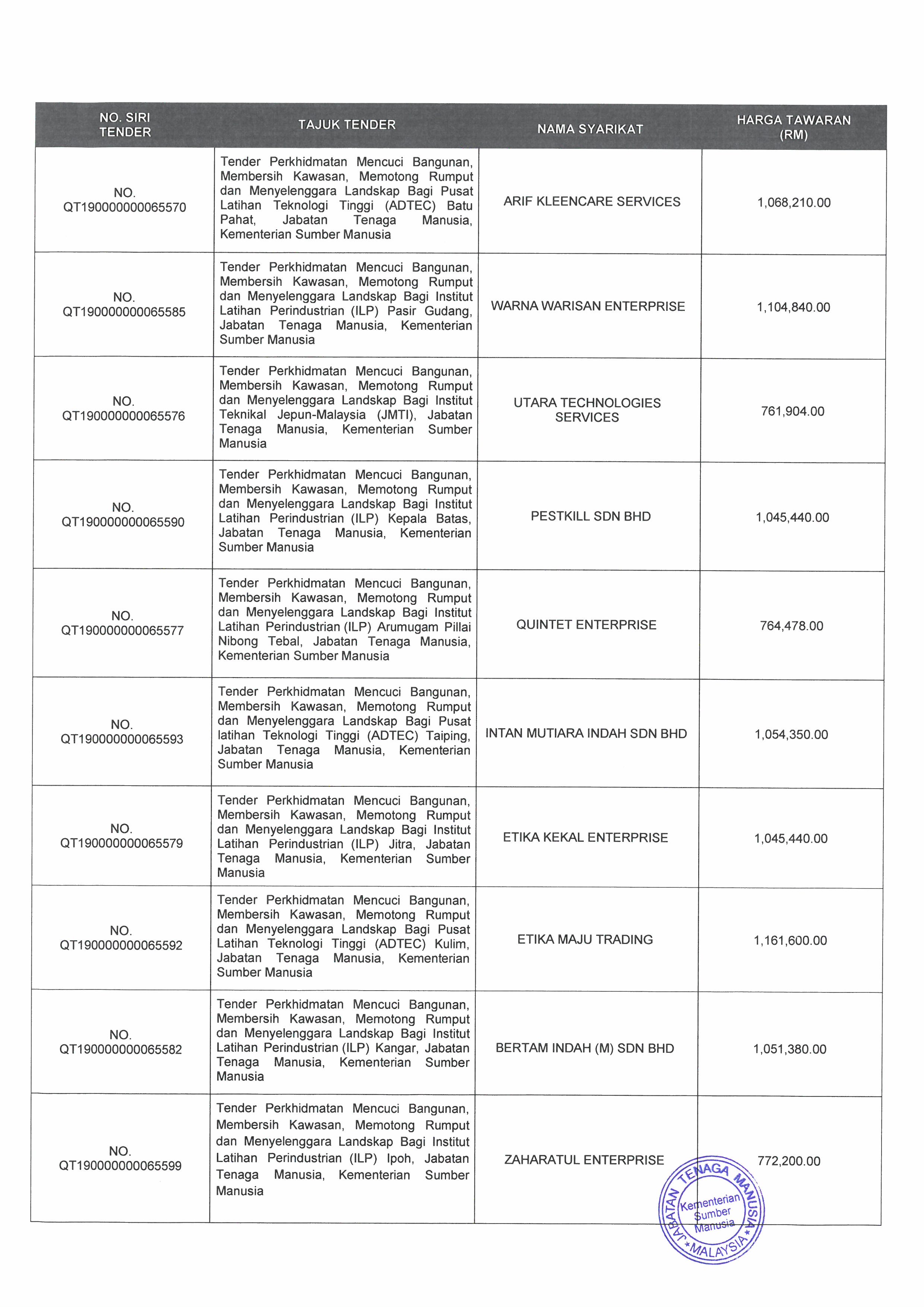 Keputusan Tender Mesyuarat Lembaga Perolehan Ksm Bil 12 2019 Bagi Perkhidmatan Mencuci Bangunan Membersih Kawasan Memotong Rumput Dan Menyelenggara Landskap Bagi Iljtm Portal Rasmi Jabatan Tenaga Manusia